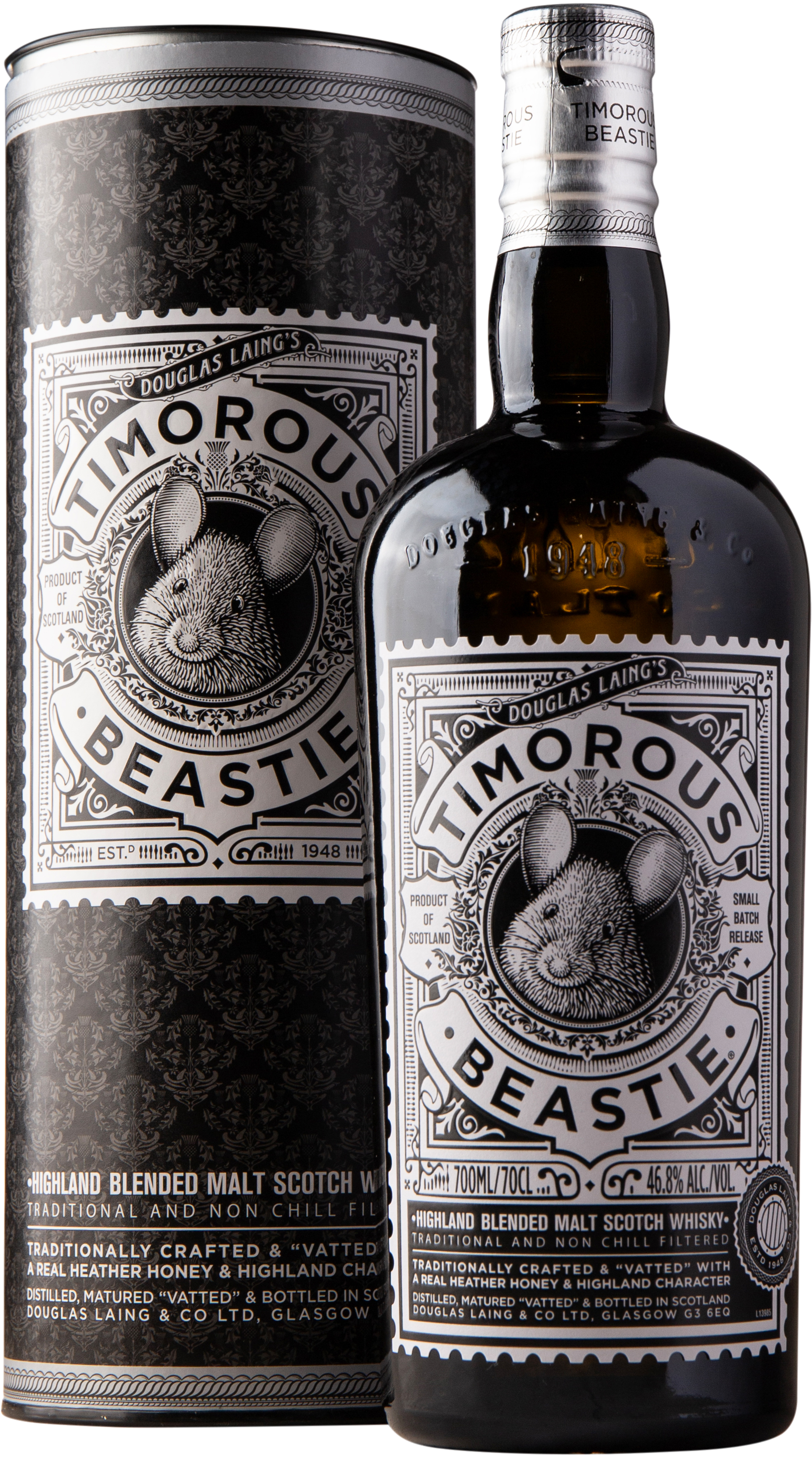 - Jeg har haft fornøjelsen af at smage Timorous Beastie, en Highland blended malt whisky fra Douglas Laing, som udelukkende består af maltwhiskyer fra Highland-regionen. Allerede visuelt præsenterer den sig flot i glasset med en let gylden farve. I næsen folder den sig hurtigt ud med en intens, men yderst behagelig aroma. Her finder du noter af honning, vanilje, malt og lette krydderier. Smagen lever fuldt op til det første indtryk. Den er fyldig, rund og silkeblød, med en flot balance mellem sødme og krydderi. Noter af malt, honning, karamel og synes faktisk at der er en smule citrus til stede også. Selvom den holder over 46% i alkoholprocent, så er den ikke duft-/ smagsmæssigt skræmmende. Virkelig fint afbalanceret. Eftersmagen er lang, varm og behagelig.